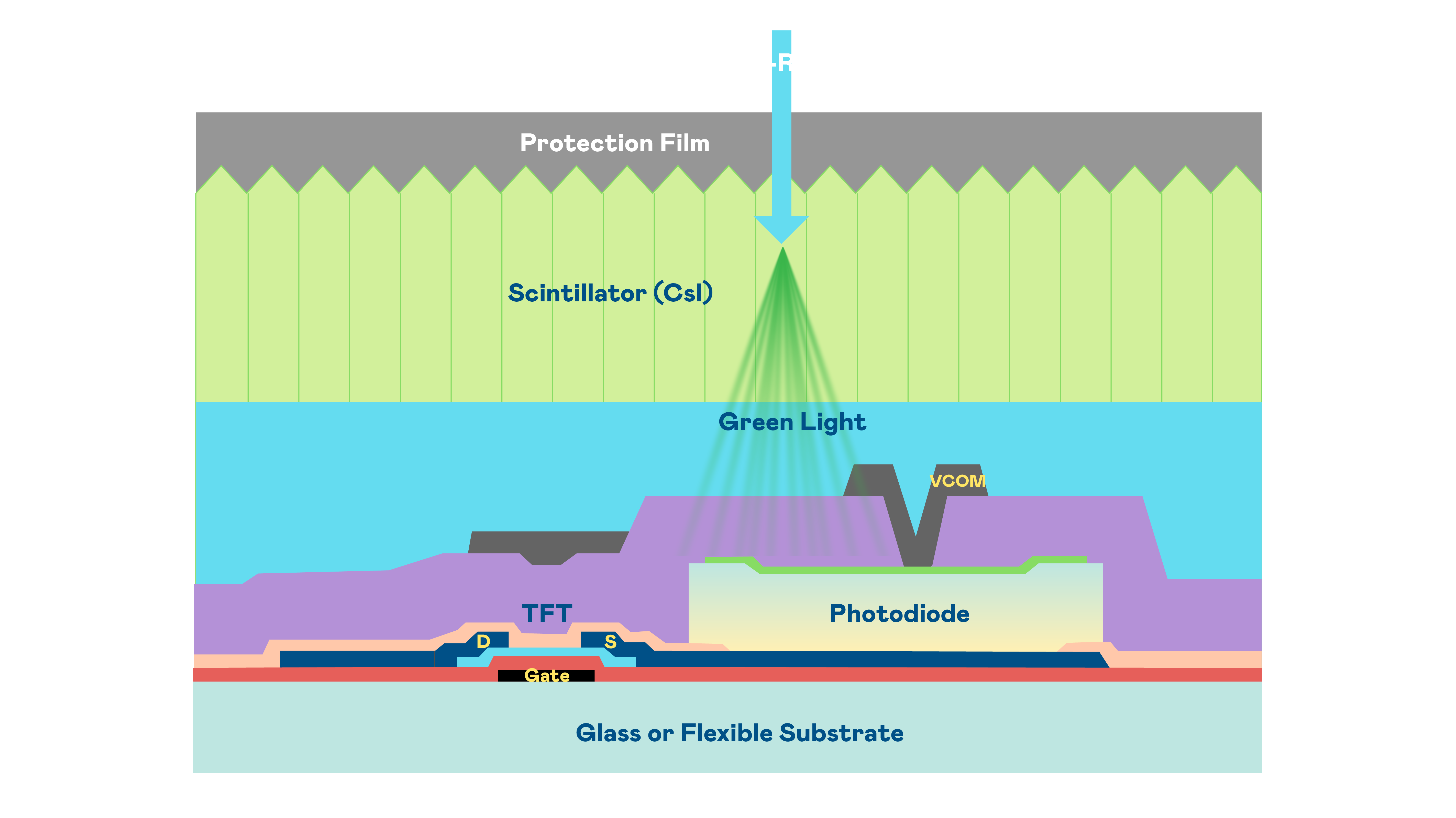 Ebpay的X光影像感测阵列使用薄膜电晶体 (TFT) 作为每个像素的读取开关,搭配光电二极体(Photodiode)的光电转换元件,用以感测X光影像讯号。